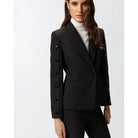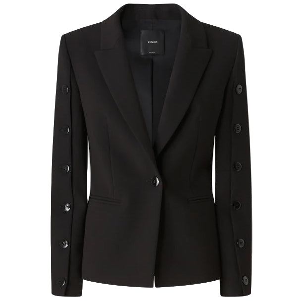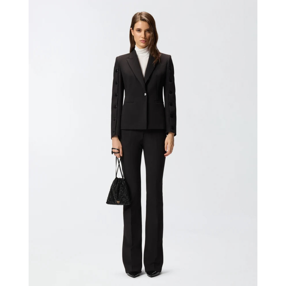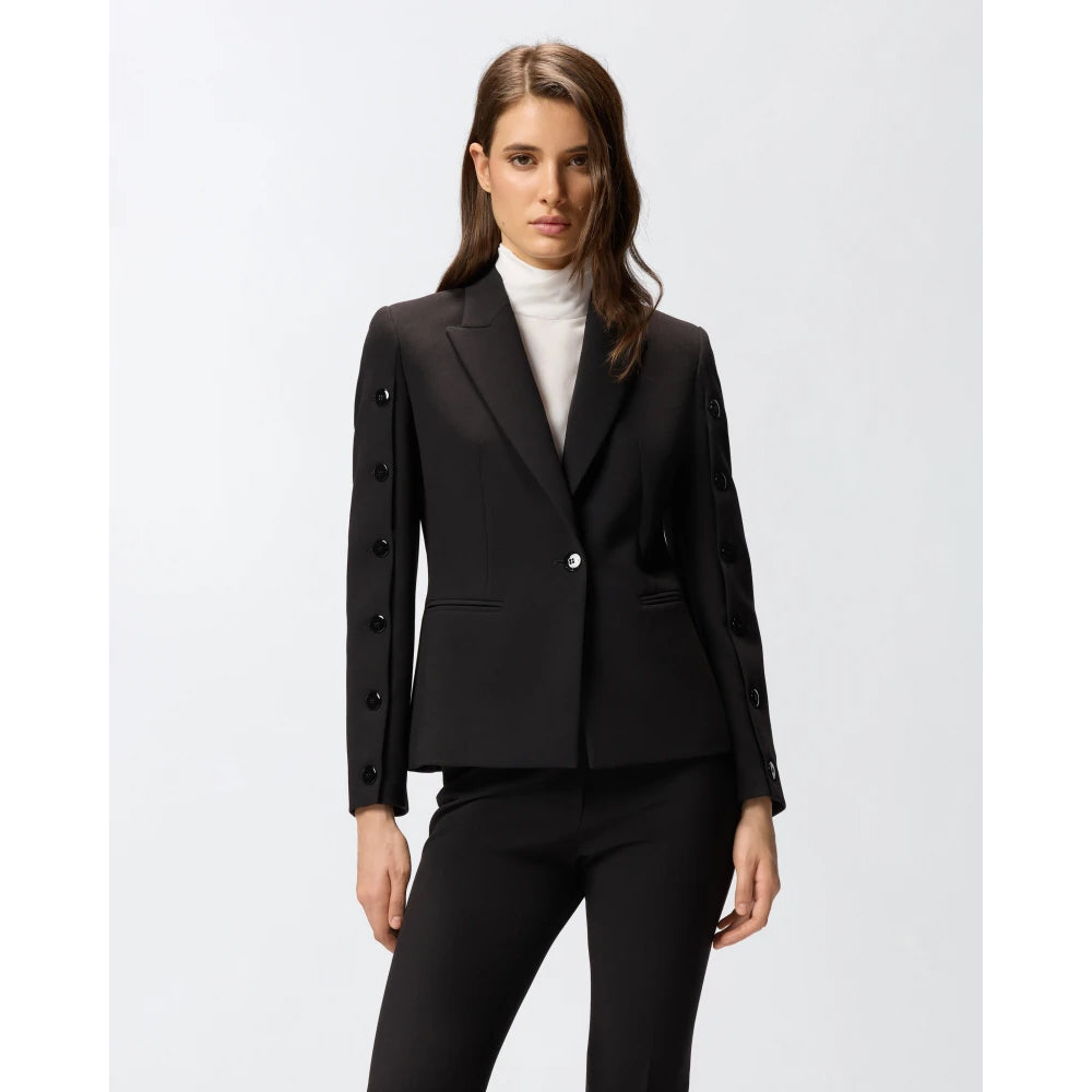 Single-breasted cinched-waist jacket with sleeves that button open to create a cape-style effect. The technical viscose fabric manages to combine softness and fluidity to create a sophisticated texture that offers optimal comfort and fit, without losing the structured appearance of the design. Understated and refined, this style is the missing piece from your daytime looks and more.
