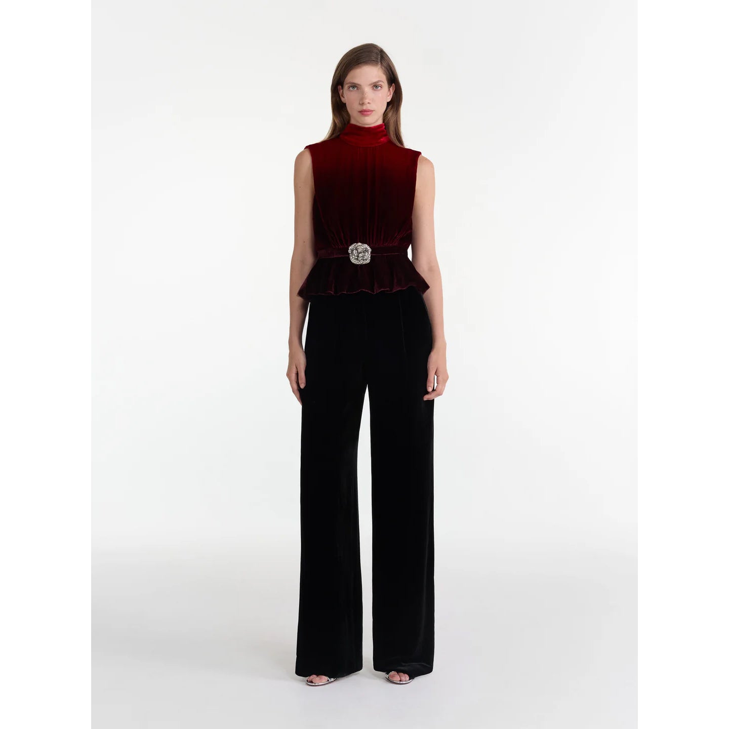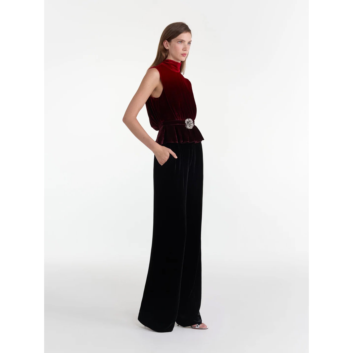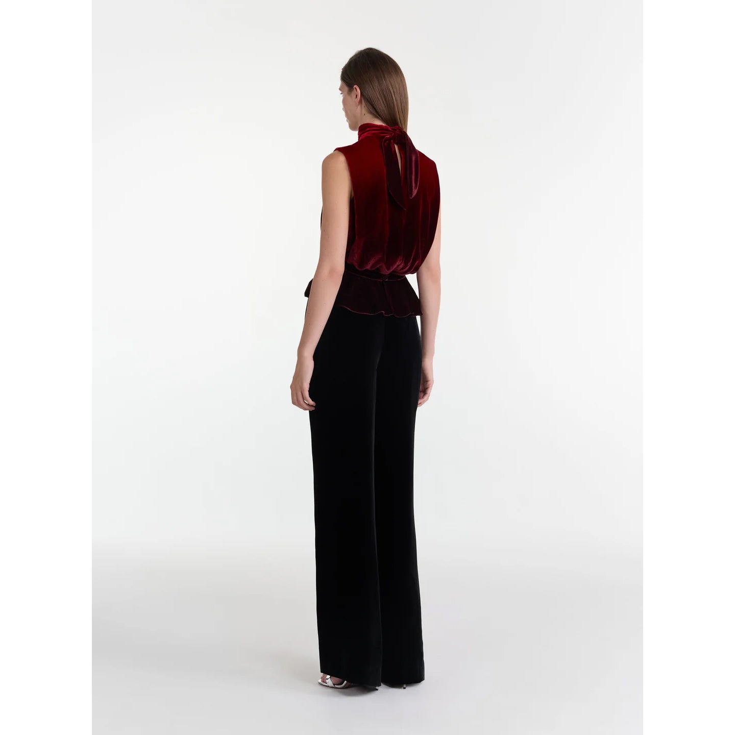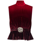The Fleur Velvet Top is a contemporary take on the classic Fleur Dress. The sleeveless top features a soft shoulder fold and a back neck tie, while the waistband is accented with a soft peplum. At the center of the waist is a statement silver 'rose' appliqué. Each petal is hand-embellished with silver crystals and beads to create jewelery-like embroidery. With its flattering silhouette and refined detailing, this top is a versatile piece that can be worn on repeat.