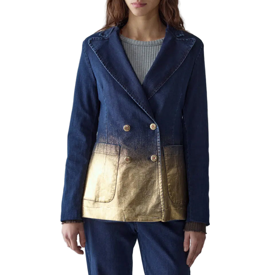Make a bold statement with this two-tone double denim blazer from Shaft Jeans. Tailored in Italy from premium stretch denim, this structured yet flexible design pairs classic craftsmanship with a modern edge. The contrast between deep indigo and gold tones gives this piece a distinctive, fashion forward finish – perfect for adding character to any look.