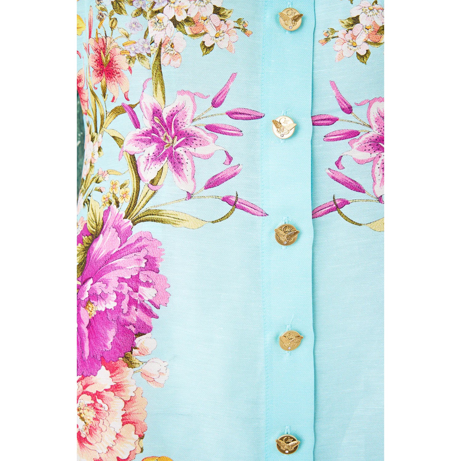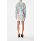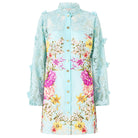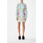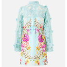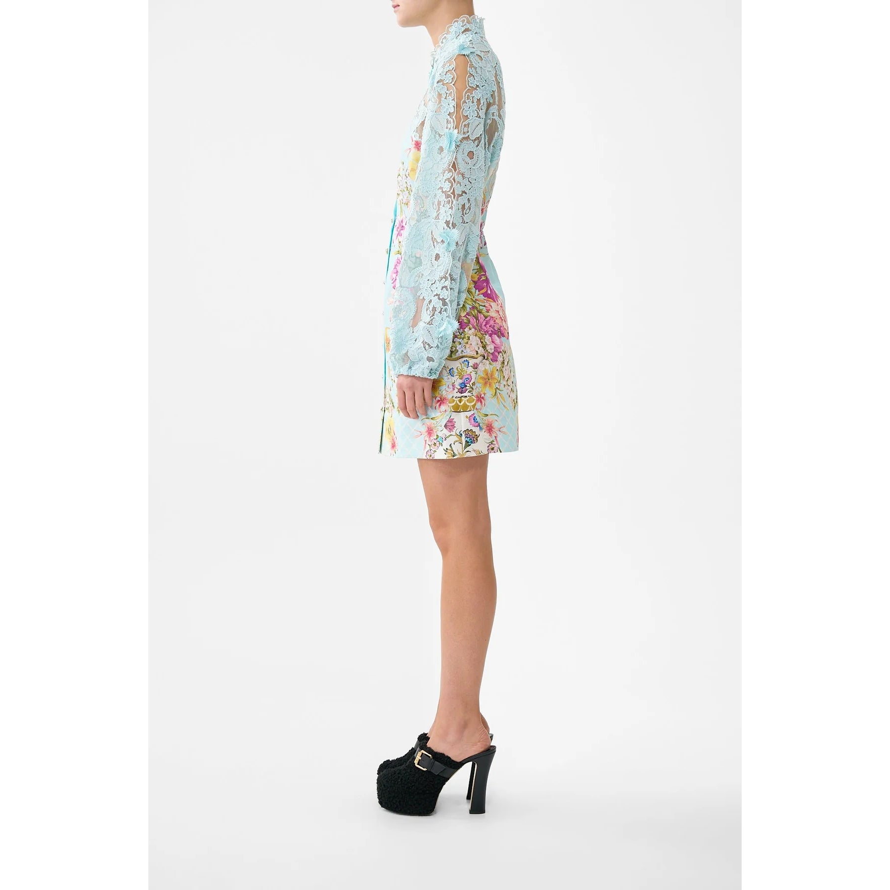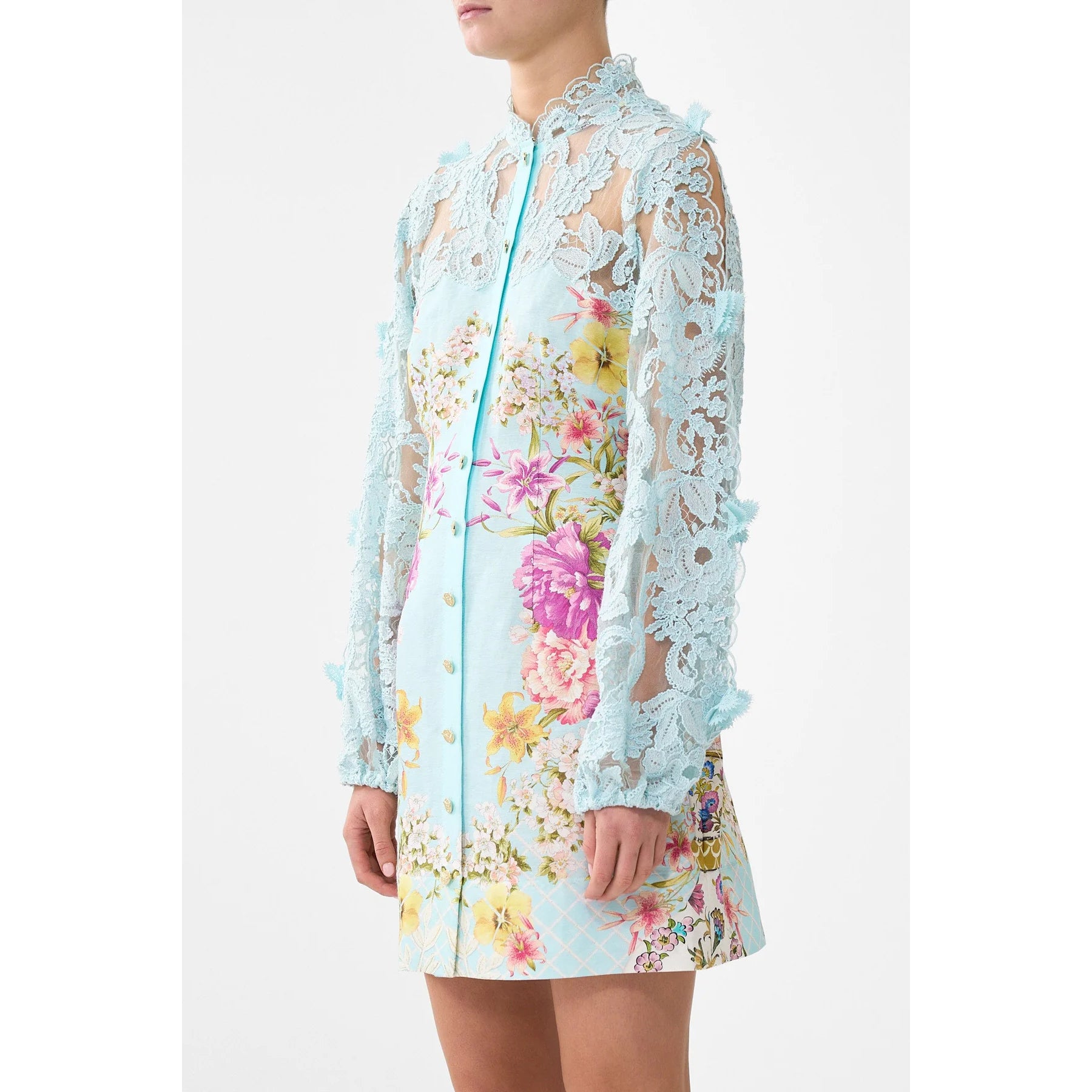 The Bazaar Blooms Lace Sleeve Mini Dress is a handcrafted silhouette designed by Camilla's  in house artisans. Reimagined in an exclusive limited edition print, this mini dress features intricate lace detailing across the bodice and sleeves, balanced by a structured collar and front button fastening for effortless wear. Long sleeves are adorned with cut out accents at the shoulder and arm, while 3D butterflies and flowers decorate the lace. Intricately placed crystal embellishments complete the design with luminous detail.