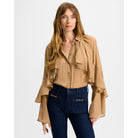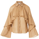 A top that steals the spotlight. Crafted from 100% premium silk chiffon in beige, Demaris is a button-down blouse defined by cascading ruffles that fall from the shoulder down the length of each arm. Flared sleeves and real shell buttons complete the look. A true statement piece, pair it with flared denim and clogs for a modern take on boho chic.