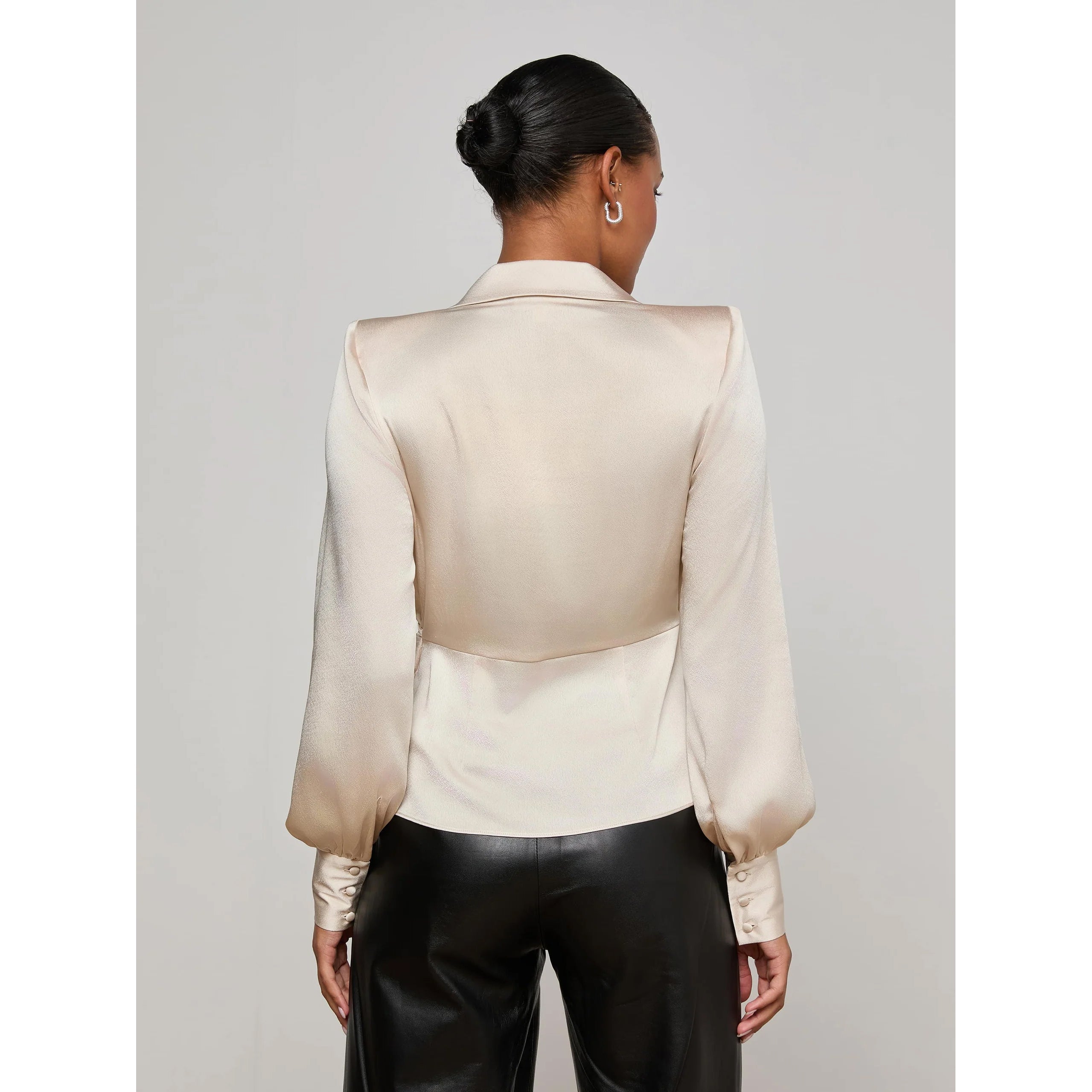 The Bernice wrap blouse in champagne satin evokes romantic elegance with delicate pleating at the shoulders, subtle shoulder pads, and a defined waist. Finished with fabric-covered buttons, rouleau loops, and cuffed sleeves, it’s a delicate yet intricately detailed piece your closet needs.