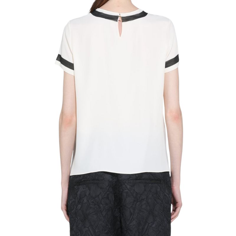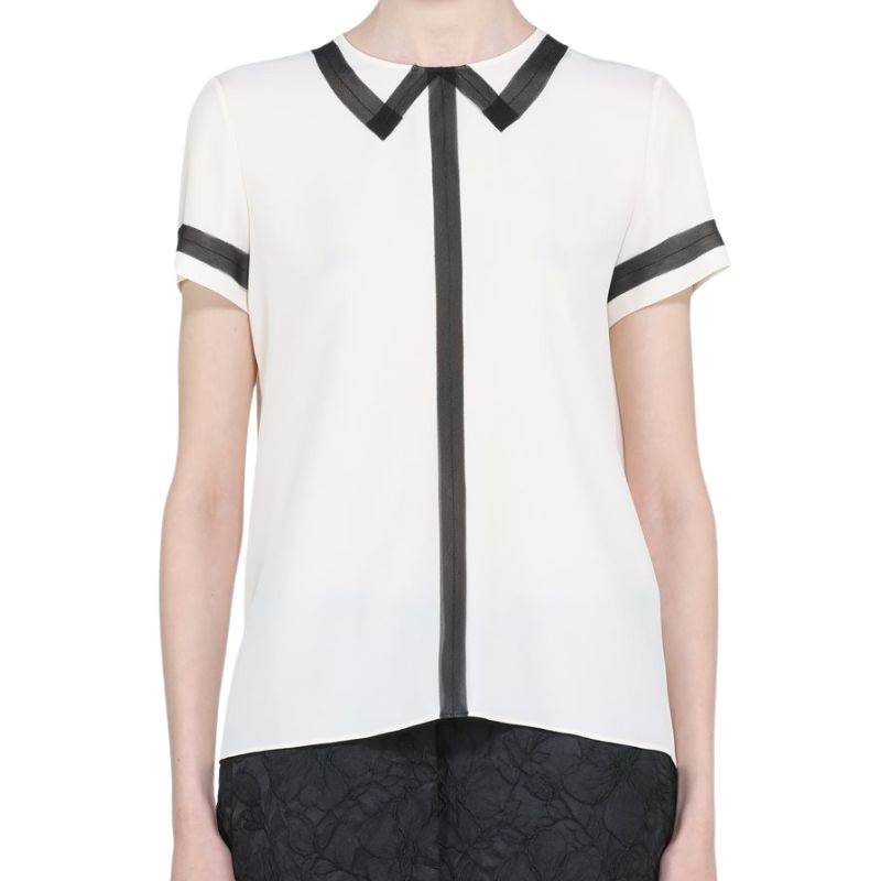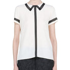 An elegant, minimalist blouse defined by sharp contrast detailing. Designed in a soft ivory tone with black trim accents, this piece offers a timeless, Parisian-inspired aesthetic that transitions effortlessly from day to evening.