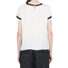 Rounded neckline with a subtle Peter Pan–style collar outlined in black trim
