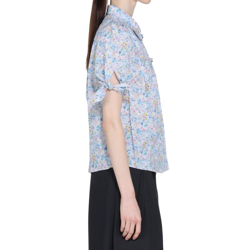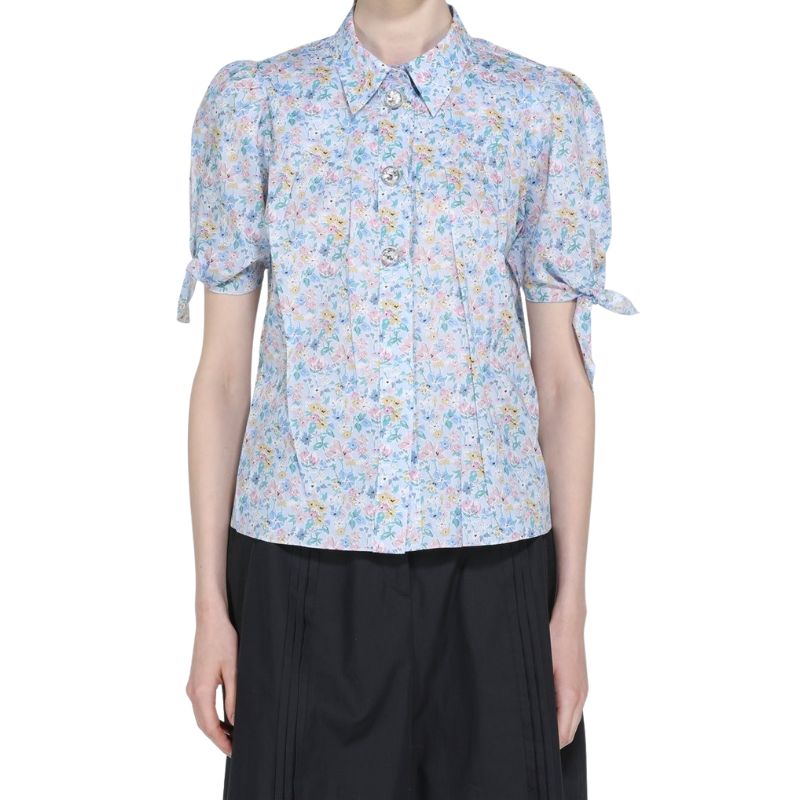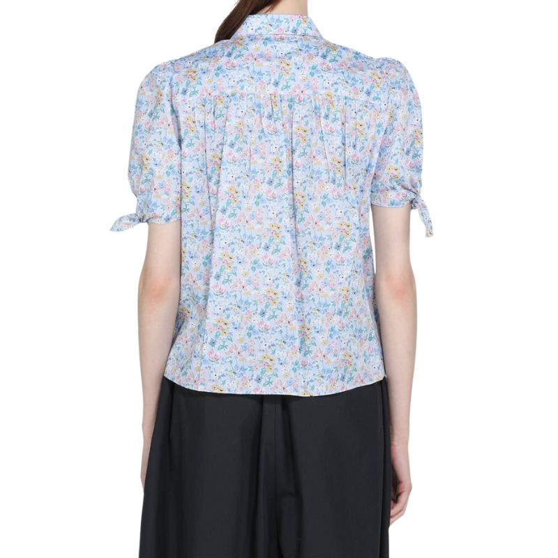 A feminine, vintage-inspired floral blouse featuring a soft pastel color palette. The top combines classic tailoring with delicate design elements, making it suitable for both casual and semi-formal styling.