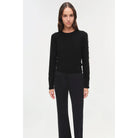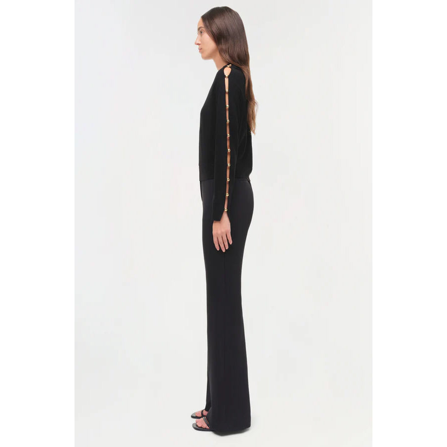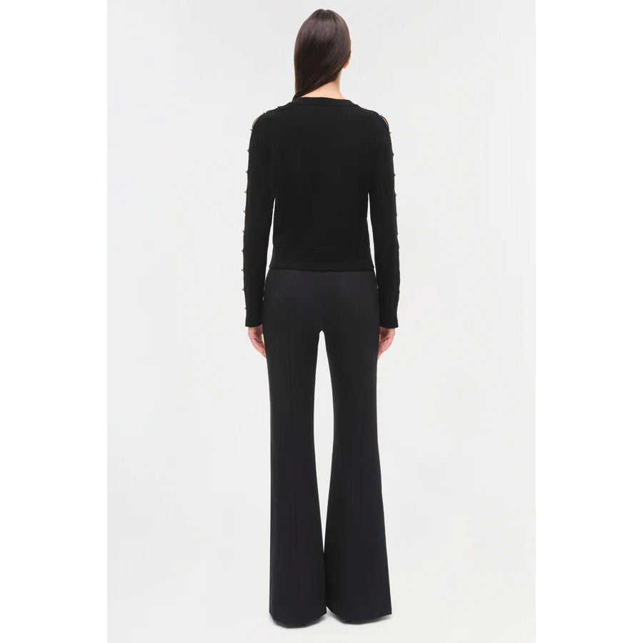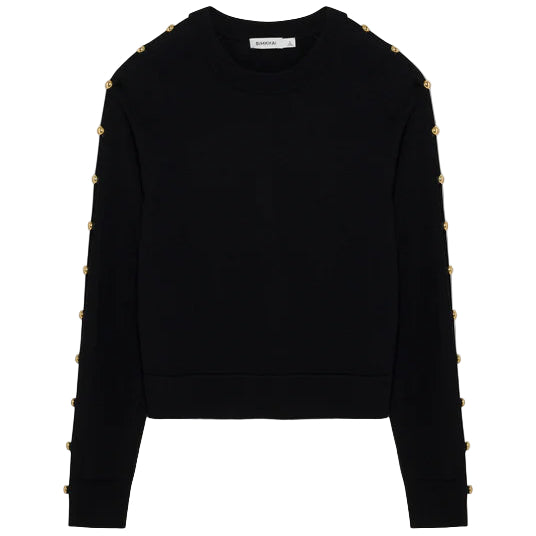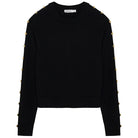 Knit in fine merino wool, this lightweight crewneck offers a clean, close silhouette. The sleeves are traced with a line of sculpted golden buttons, balancing softness with structure. A refined essential, elevated by detail.