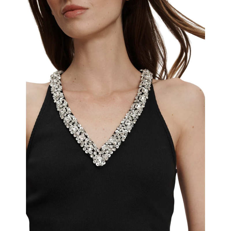 Black Stretch-Cotton Rhinestone Neck Tank Top