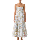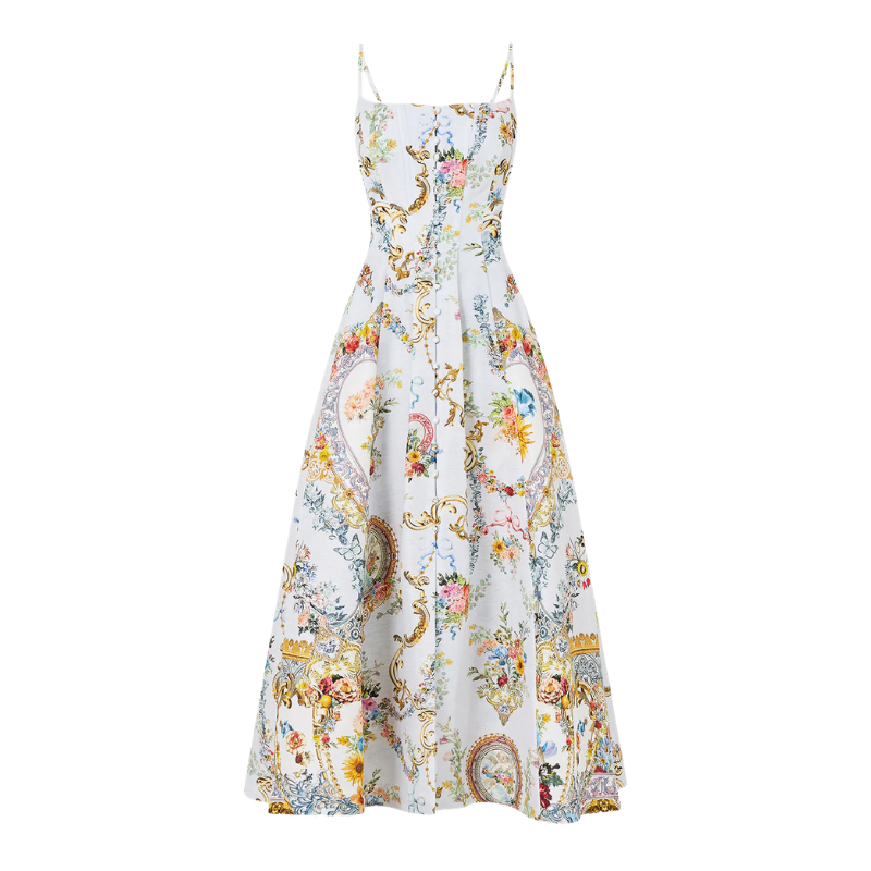 The Seville Sweetheart Corset Dress With Long Flared Skirt is a handcrafted silhouette. Conceived in an exclusive limited edition print, this silk-linen corset dress is completely lined and crafted with a full, flared skirt that falls to a maxi length hemline. Its adjustable straps and back zip fastening offer versatility while crystal embellishment add luminous detail.
