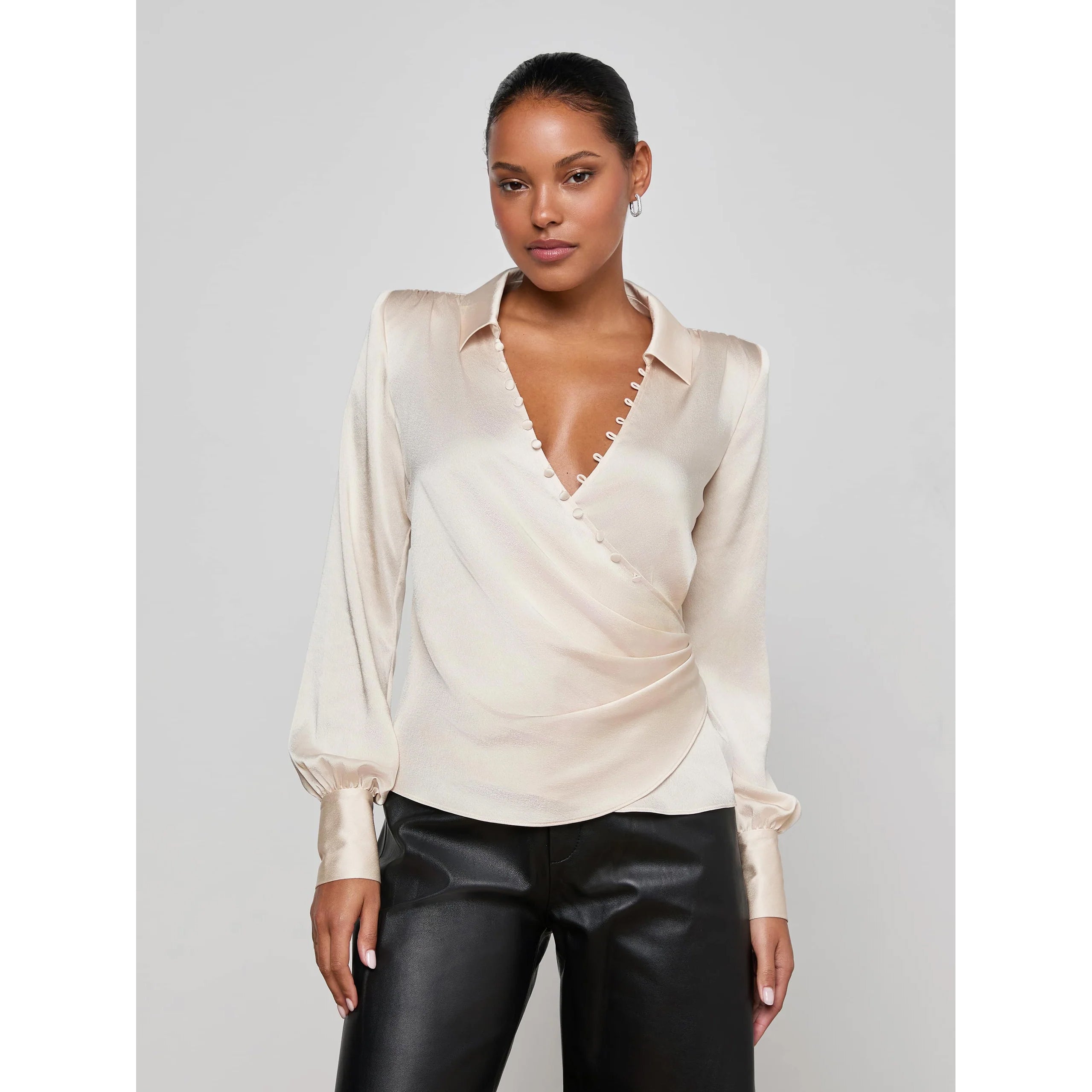 The Bernice wrap blouse in champagne satin evokes romantic elegance with delicate pleating at the shoulders, subtle shoulder pads, and a defined waist. Finished with fabric-covered buttons, rouleau loops, and cuffed sleeves, it’s a delicate yet intricately detailed piece your closet needs.