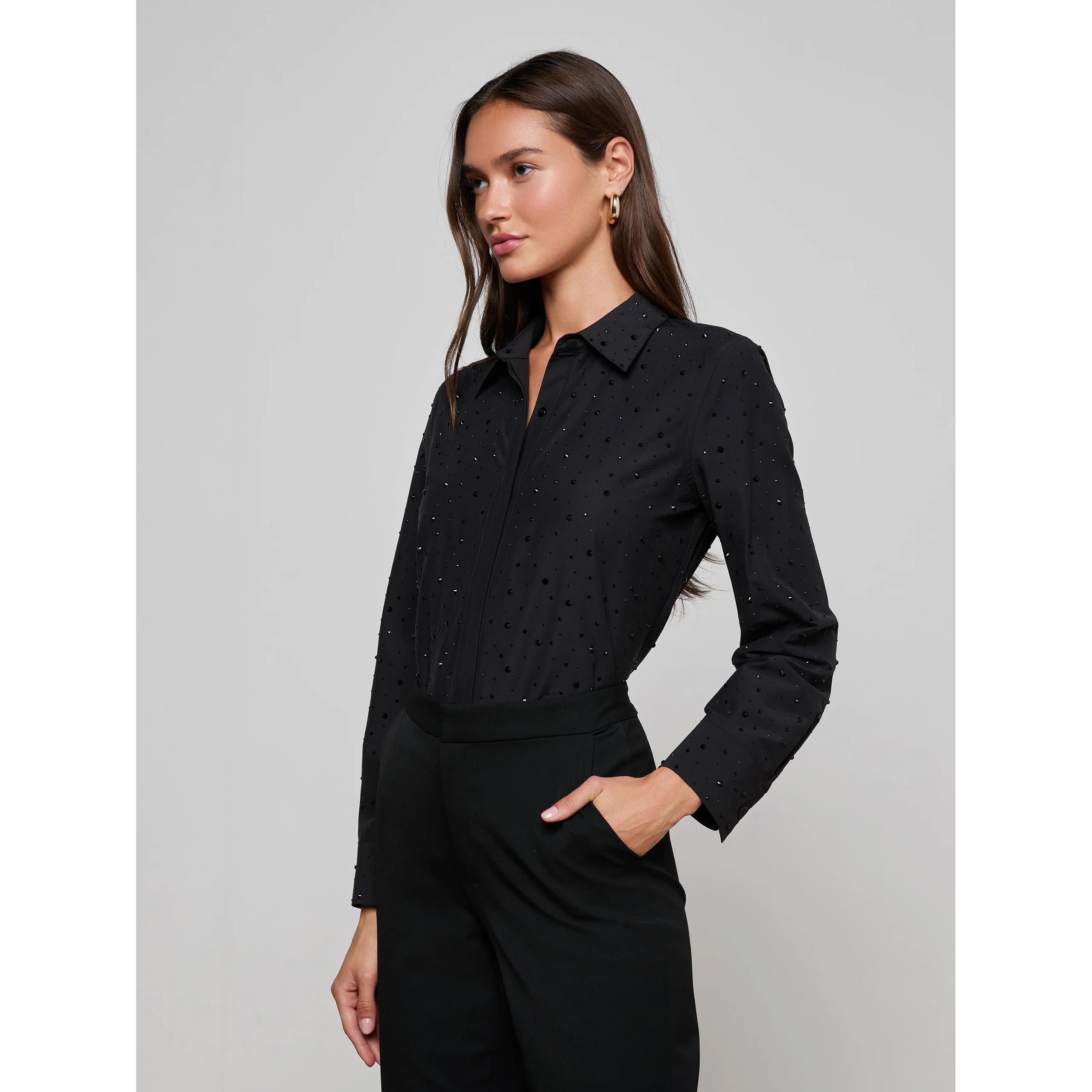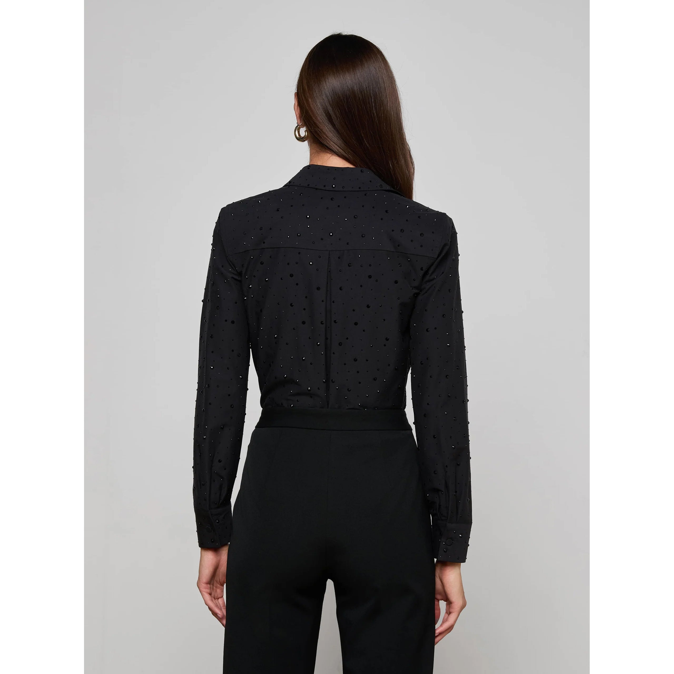 We’ve given the classic poplin shirt the L’AGENCE treatment with tonal black crystals for easy glamour. Crafted from poplin with a relaxed fit, Ellery is the long sleeve blouse you’ll reach for every season. Dress it down for daytime with your favorite jeans or pair it with a silk pant for a cool evening look.
